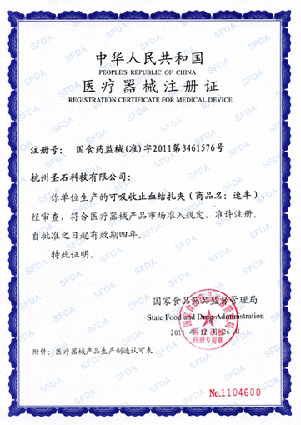 近日,我公司產品可吸收止血結扎夾(商品名:速豐)正式獲得國家食品藥品監督管理局頒發的第三類醫療器械產品注冊證書,注冊證號:國食藥監械(準)字2011第3461576號。(參見國家藥監局網站http://www.sda.gov.cn/WS01/CL0403/68257.html
